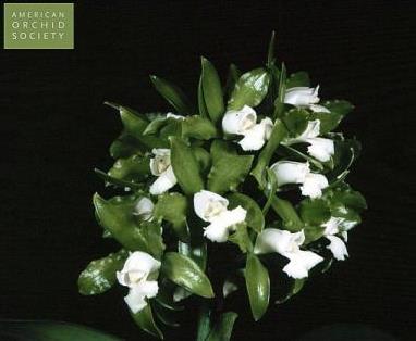 C. leopoldii (formerly guttata) alba 'Field's', HCC/AOS, award photo from 1972. 'Field's' is one of the seedlings from the self-pollination of Bracey's original C. guttata alba. It is named for Roy Field, a long-time member of SCOS, not related to former SCOS President George Dean Field.